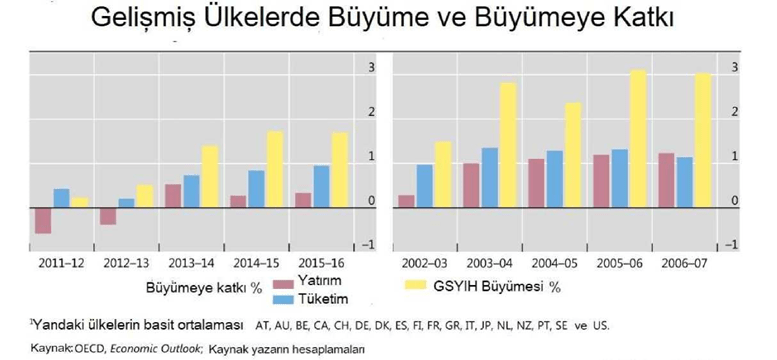 Önceki genişlemelerdeki büyüme şablonları farklı idi. Son yıllardaki en çarpıcı özellik, yatırımın nispeten küçük bir rol oynamasıdır. Nitekim, 2013-14 yıllarında pozitife dönerken, yatırımın ortalama büyümeye katkısı 2015-16 döneminde sadece 0,3 puan olarak gerçekleşti.