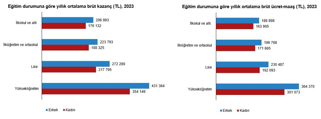 Kazanç düzeylerinin hem erkeklerde hem de kadınlarda eğitim durumu ile birlikte yükseldiği görüldü. Eğitim durumuna göre en yüksek yıllık ortalama brüt kazancı yükseköğretim eğitim düzeyine sahip olanlar elde etti. Bu eğitim düzeyinde yıllık ortalama brüt kazanç erkeklerde 431 bin 364 TL, kadınlarda ise 354 bin 149 TL oldu.