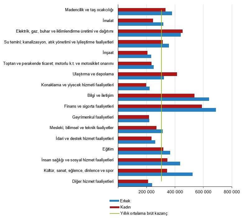Kadın çalışanların yıllık ortalama brüt kazancı, ulaştırma ve depolama faaliyetinde 414 bin 502 TL, elektrik, gaz, buhar ve iklimlendirme üretimi ve dağıtımı faaliyetinde 453 bin 413 TL ile bu sektörlerdeki erkek çalışanların yıllık ortalama brüt kazancının üzerinde gerçekleşti.