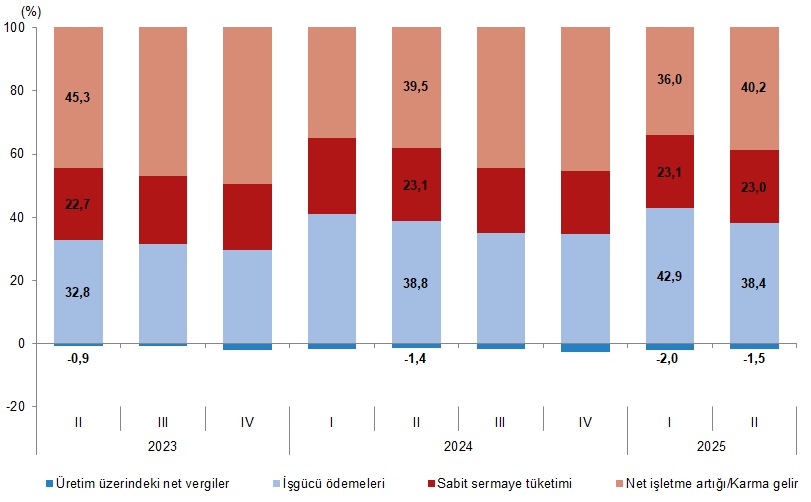 İşgücü ödemelerinin cari fiyatlarla Gayrisafi Katma Değer içerisindeki payı geçen yılın ikinci çeyreğinde %38,8 iken, bu oran 2025 yılında %38,4 oldu. Net işletme artığı/karma gelirin payı ise %39,5 iken %40,2 oldu.