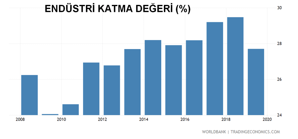 Yukarıdaki grafikte, Türkiye İmalat Sanayi Katma Değeri, GSYİH yüzdesi olarak 1960-2020 yılları olarak verilmektedir. Grafikten göüldüğü gibi, 1960’dan başlıyarak katma değer devamlı yükselerek 1998 yılında en yüksek değeri olan %23’e ulaşmaktadır. Buradan 1998 yılına kadar olan dönemde nibeten yatay bir seyir izlenmekte, ancak 1999 yılından başlayarak hızlı bir düşüş göstererek, 2010 yılında %15’e gerilemektedir. Bunun bir nedeni, bu dönemde ülkemize giren sıcak paranın, Türk İirası’nın değerini aşırı artırarak, önceleri ülkede üretilen ara malların yerine, ithallerinin kullanımını cazip hale getirmesi, olabilir. 2011 yılından itibaren tekrar bir yükselme eğilimi başlamış ve 2020 yılı için %18 (1983 yılı değerine eşit) olarak hesaplanmıştır.