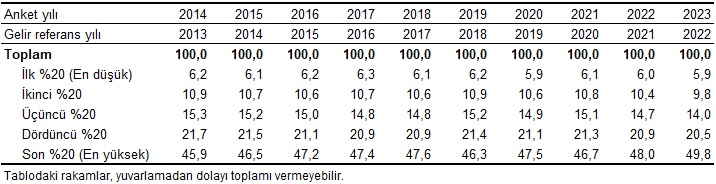 Son yapılan araştırma sonuçlarına göre; en yüksek eşdeğer hanehalkı kullanılabilir fert gelirine sahip %20’lik grubun toplam gelirden aldığı pay bir önceki yıla göre 1,8 puan artarak %49,8’e çıkarken, en düşük gelire sahip %20’lik grubun aldığı pay 0,1 puan azalarak %5,9 oldu.