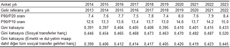 Toplumun en yüksek gelir elde eden %20’sinin elde ettiği payın en düşük gelir elde eden %20’sinin elde ettiği paya oranı şeklinde hesaplanan P80/P20 oranı 7,9’dan 8,4’e, gelirden en fazla pay alan %10’unun elde ettiği gelirin en az pay alan %10’unun elde ettiği gelire oranı şeklinde hesaplanan P90/P10 oranı ise 14,2’den 15,0’a yükseldi.