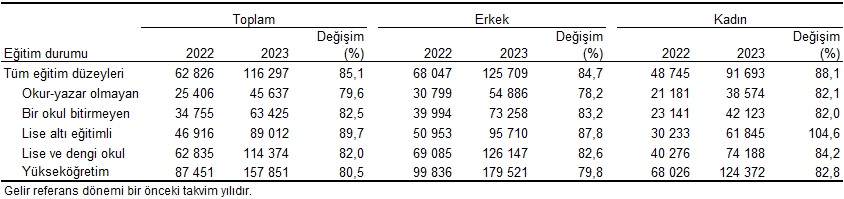 Yıllık ortalama esas iş gelirleri sırasıyla yükseköğretim mezunlarında 157 bin 851 TL, lise ve dengi okul mezunlarında 114 bin 374 TL, lise altı eğitimlilerde 89 bin 012 TL, bir okul bitirmeyenlerde 63 bin 425 TL ve okur-yazar olmayan fertlerde 45 bin 637 TL olarak hesaplandı. Geçen yıla göre yıllık ortalama esas iş gelirinde en yüksek artış %89,7 ile lise altı eğitimli, en düşük artış ise %79,6 ile okur-yazar olmayan fertlerde oldu.
