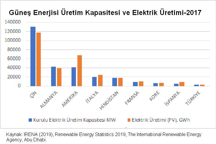 Türkiye’de 2017 yılı itibariyle kurulu toplam güneş kollektör alanı 20.000.000 m2’ye yakın olarak hesaplanmıştır. 2017 sonu itibarıyla toplam kurulu gücü 3.421 MW olan 3.616 güneş enerjisi santrali bulunmaktadır. Bu, toplam potansiyelin %4’üne eşdeğerdir. 2017 yılında güneş enerjisine dayalı elektrik üretimi 2.684 GWh gerçekleşmiş, elektrik üretiminin sadece %0,91’i güneş enerjisinden elde edilmiştir.