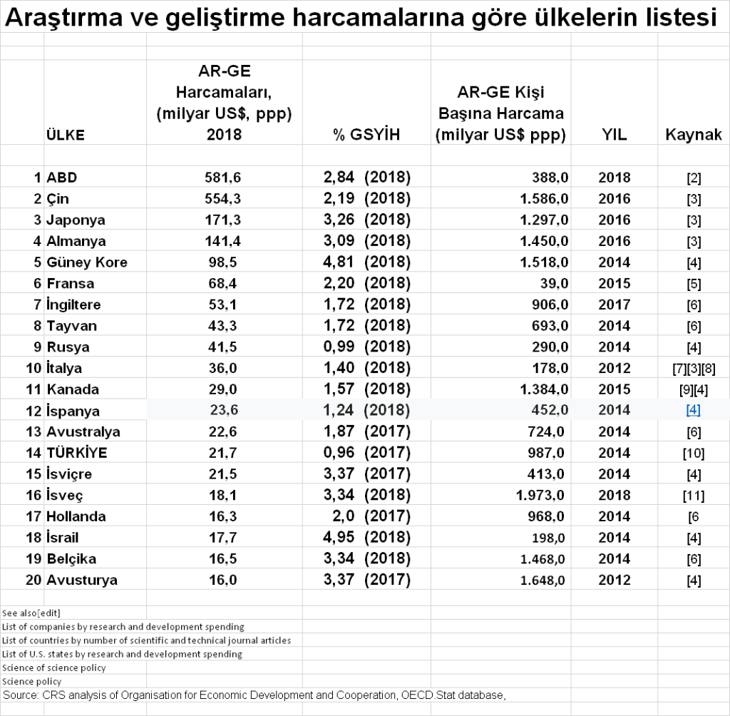 Ancak, bu rakamları GSVİH yüzdesi olarak ifade etmek, daha iyi anlatım sağlar. Bu anlamda, İsrail yüzde 4,95 ile başı çekmektedir. Onu yüzde 4,81 ile Güney Kore izlemektedir. Karşılaştırma için, bütün OECD ülkeleri ortalaması yüzde 2.4’tür.