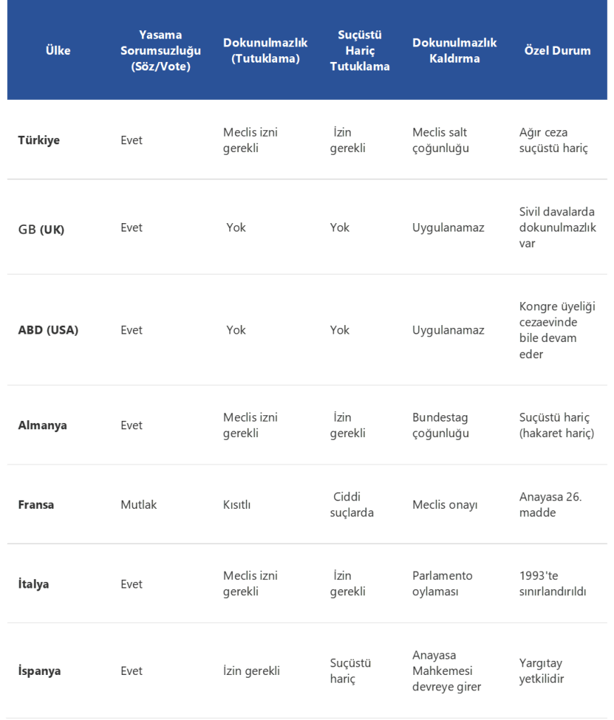 Türkiye’nin milletvekili dokunulmazlığı, Almanya, Fransa, İngiltere, ABD ve İsveç gibi ülkelere kıyasla “daha kapsamlı ve mutlak” bir koruma sağlıyor. Bu durum, yasama-yürütme-yargı dengesinde, yasamanın ağırlığını artırırken, yargı denetimini zayıflatabiliyor. Gelişmiş ülkelerde ise dokunulmazlık dar yorumlanarak, yargı erişimini kolaylaştırıyor ve hesap verebilirliği güçlendiriyor.
